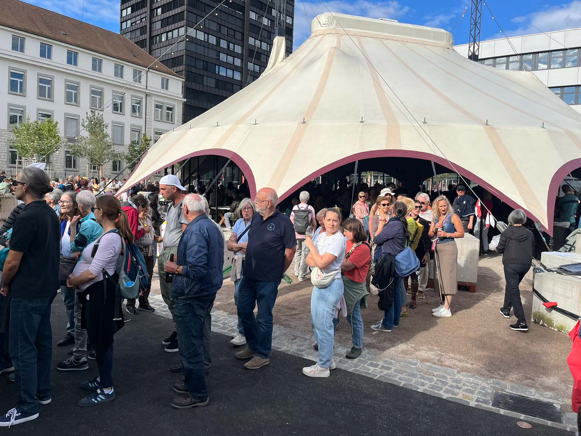 Geduldig wurde in der Schlange gewartet, um eines der 700 auf Kollektenbasis offerierten Menüs zu probieren – aufgrund der hohen Nachfrage waren es 200 Portionen mehr als ursprünglich geplant. Das freute auch die Mitglieder von Kulturaktiv und der Reformierten Kirche sehr: Die Initiator:innen Susanne Slavicek, Nadine Tobler und Pfarrer Res Peter sind sich einig: «Dass sich mit dem Stadtpicknick-meets-Foodsave-Bankett so viele Menschen auf dem neuen Eventplatz zusammenfinden und Kultur erleben und den Foodsave-Gedanken weitertragen, ist einfach nur grossartig.»