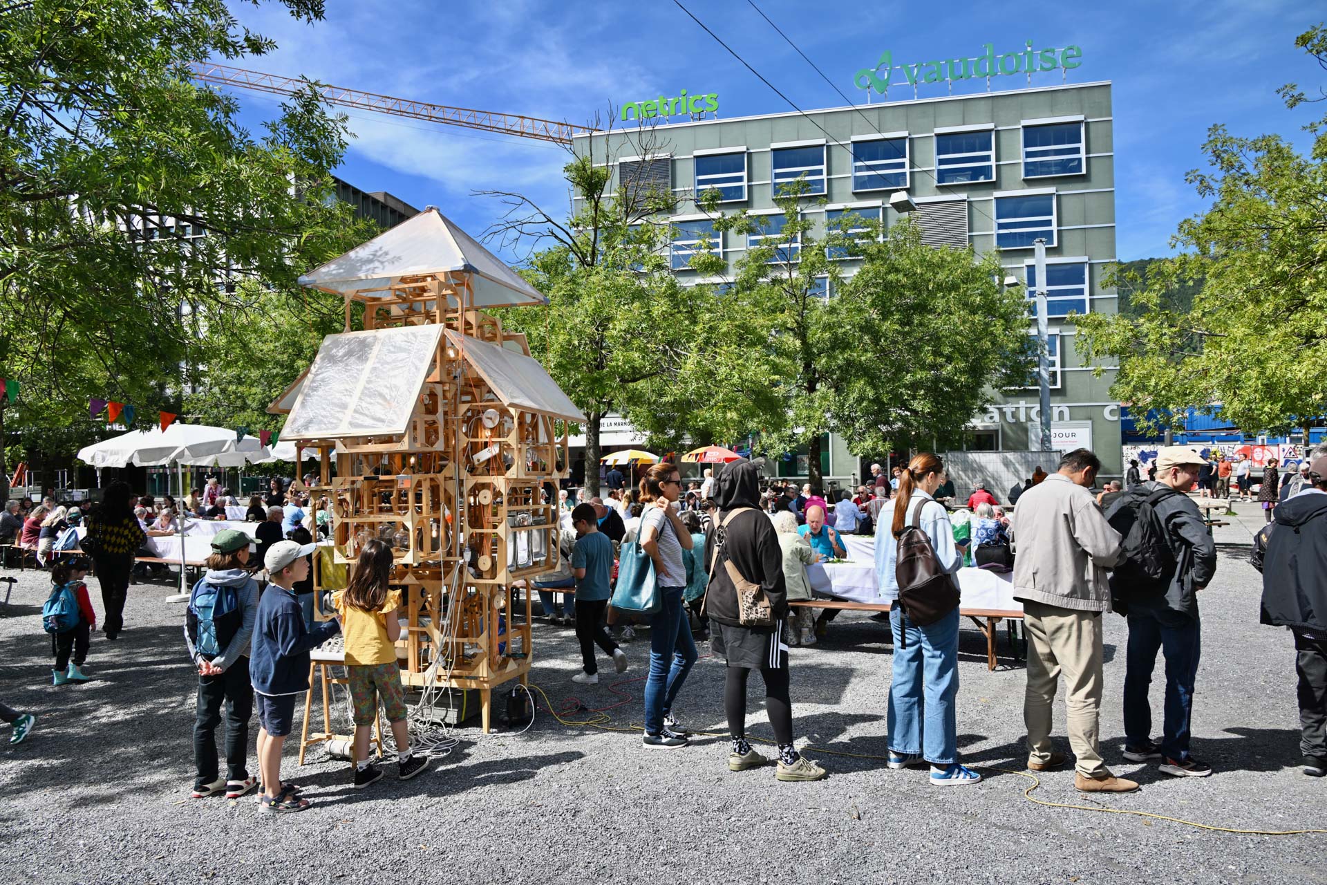Der Künstler Rolf Scherler ist während dem ganzen Anlass mit seinem Klangturm anwesend.