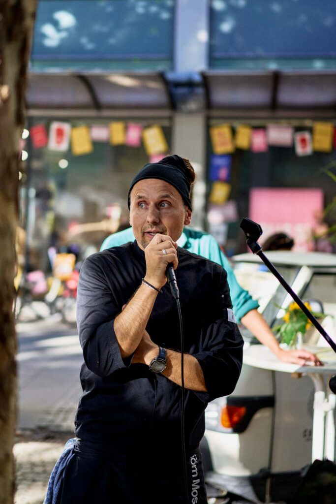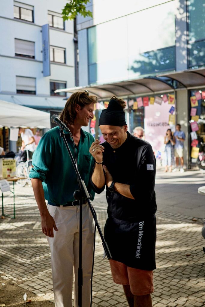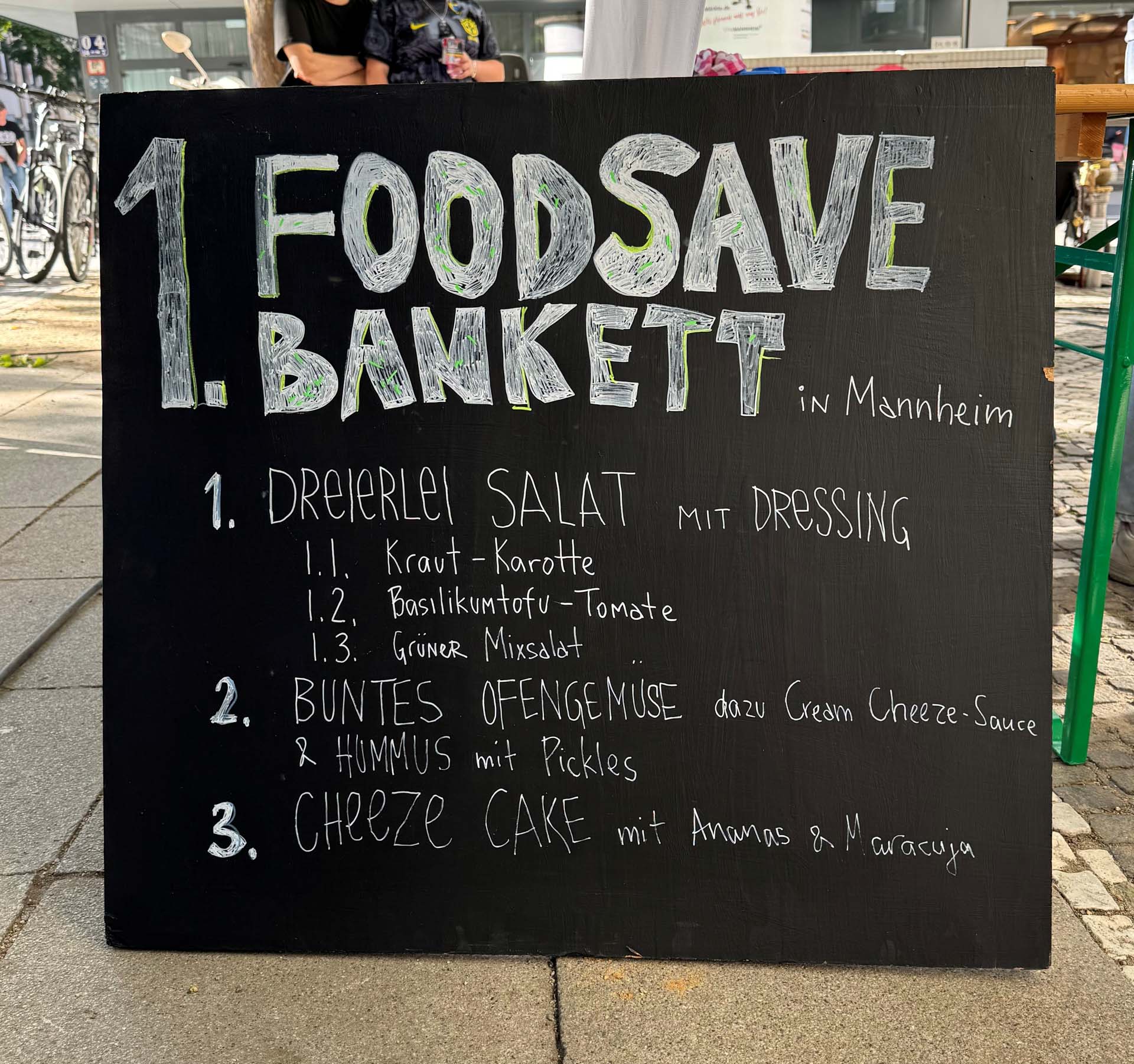 Starkoch Björn Moschinski und Pfarrer Friedel Goetz von der Christusfriedengemeinde organisierten gemeinsam mit zahlreichen Sponsor:innen das erste Foodsave-Bankett in Deutschland. Aus ursprünglich geplanten 300 Kilo wurden am Ende drei Tonnen gerettete Lebensmittel, die auf den Mannheimer Kapuzinerplanken kostenlos an Passant:innen verteilt wurden. Moschinski zauberte daraus ein Drei-Gänge-Menü: ein Dreierlei-Salat mit Basilikum-Tofu, Ofengemüse mit Kartoffeln und Wurzelgemüse sowie einen veganen Käsekuchen aus gespendetem Joghurt.