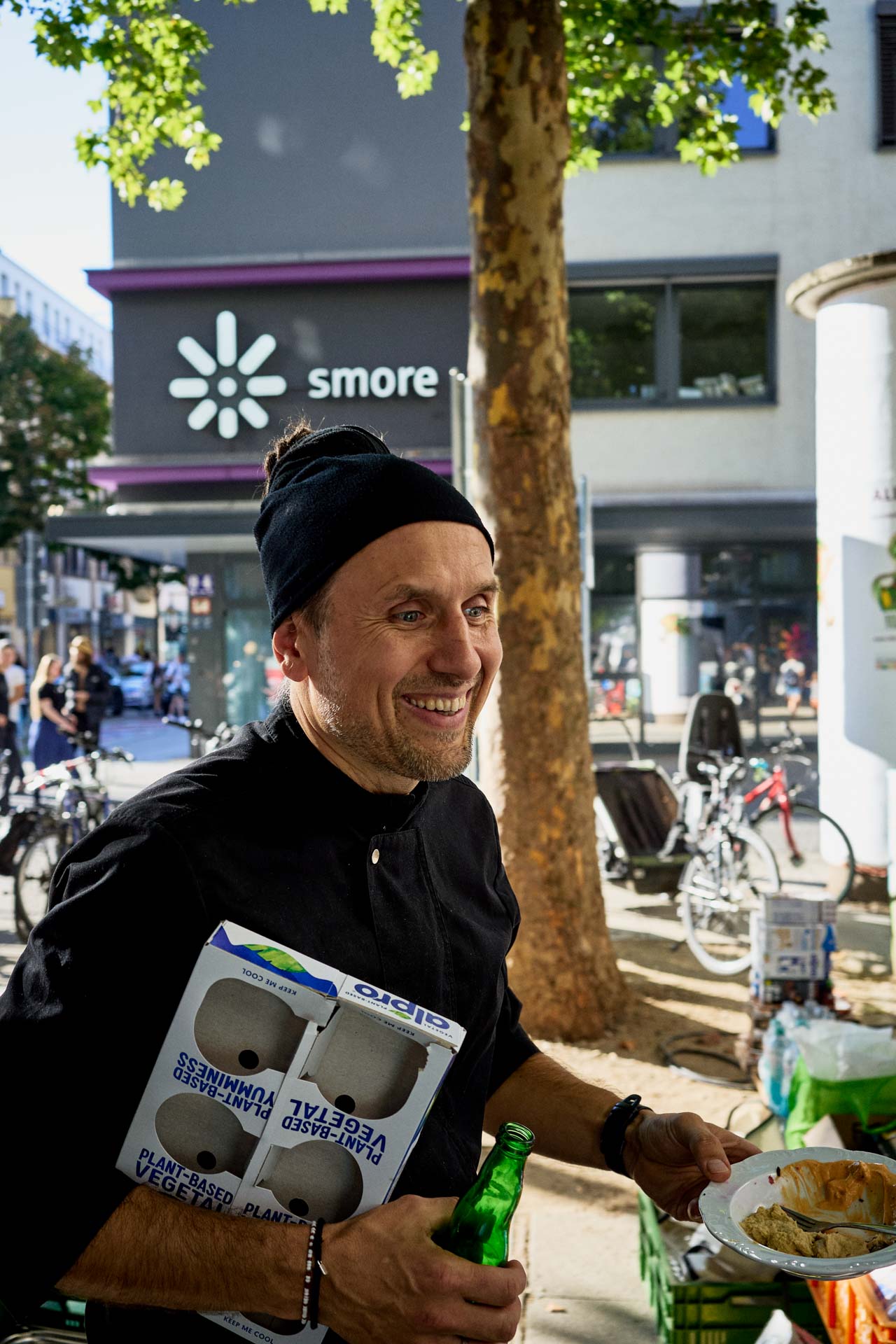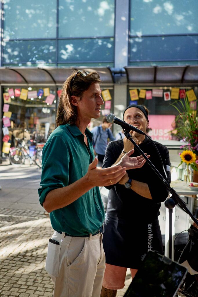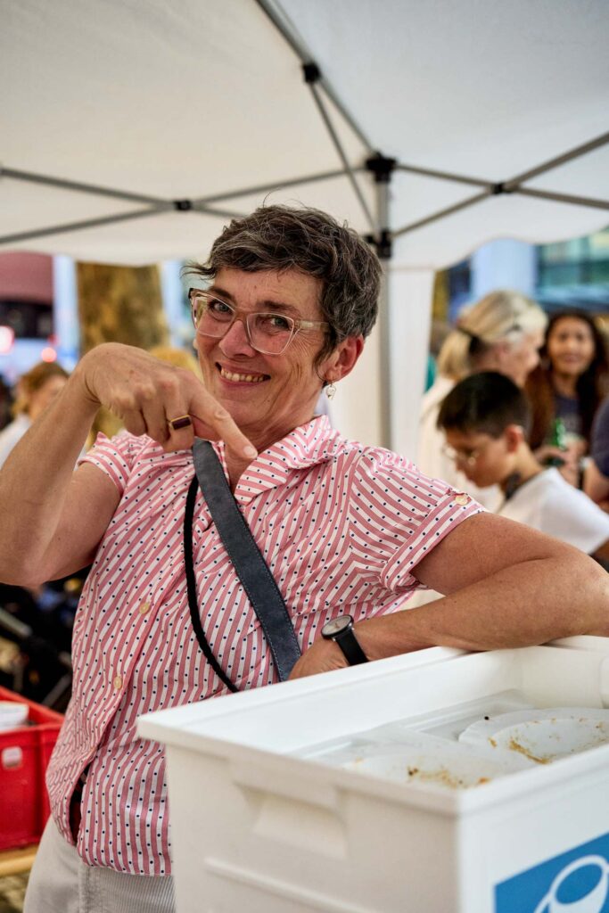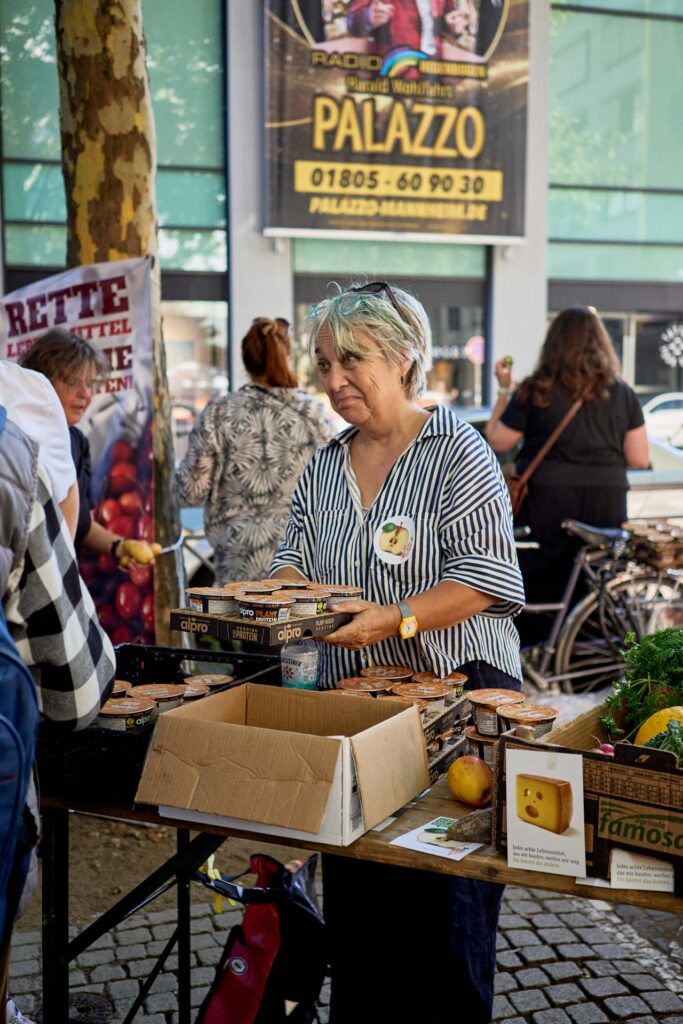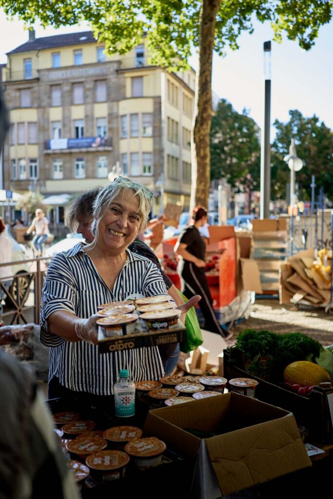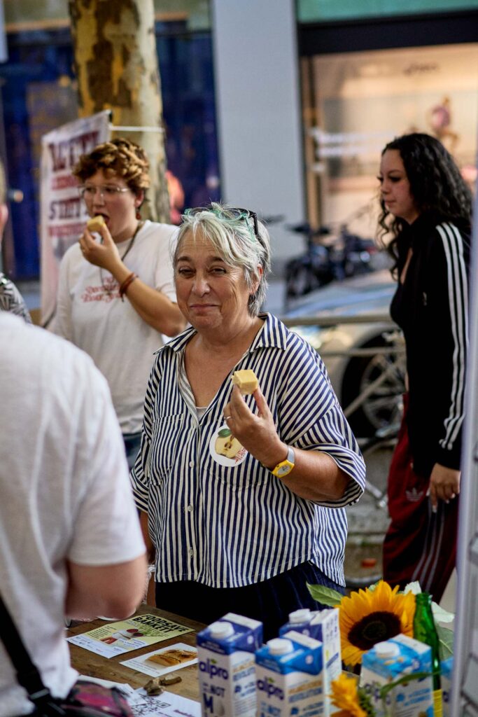 Auch die Verbraucherzentrale war vor Ort und sensibilisierte mit einem Quiz zur Haltbarkeit von Lebensmitteln. Geschichten von Kriegskindern erinnerten daran, wie selbstverständlich früher jedes Lebensmittel genutzt wurde. Die Stimmung war ausgelassen: Paletten voller veganer Milch und Joghurt wurden verteilt, spontane Begegnungen sorgten für Freude und Gemeinschaft.