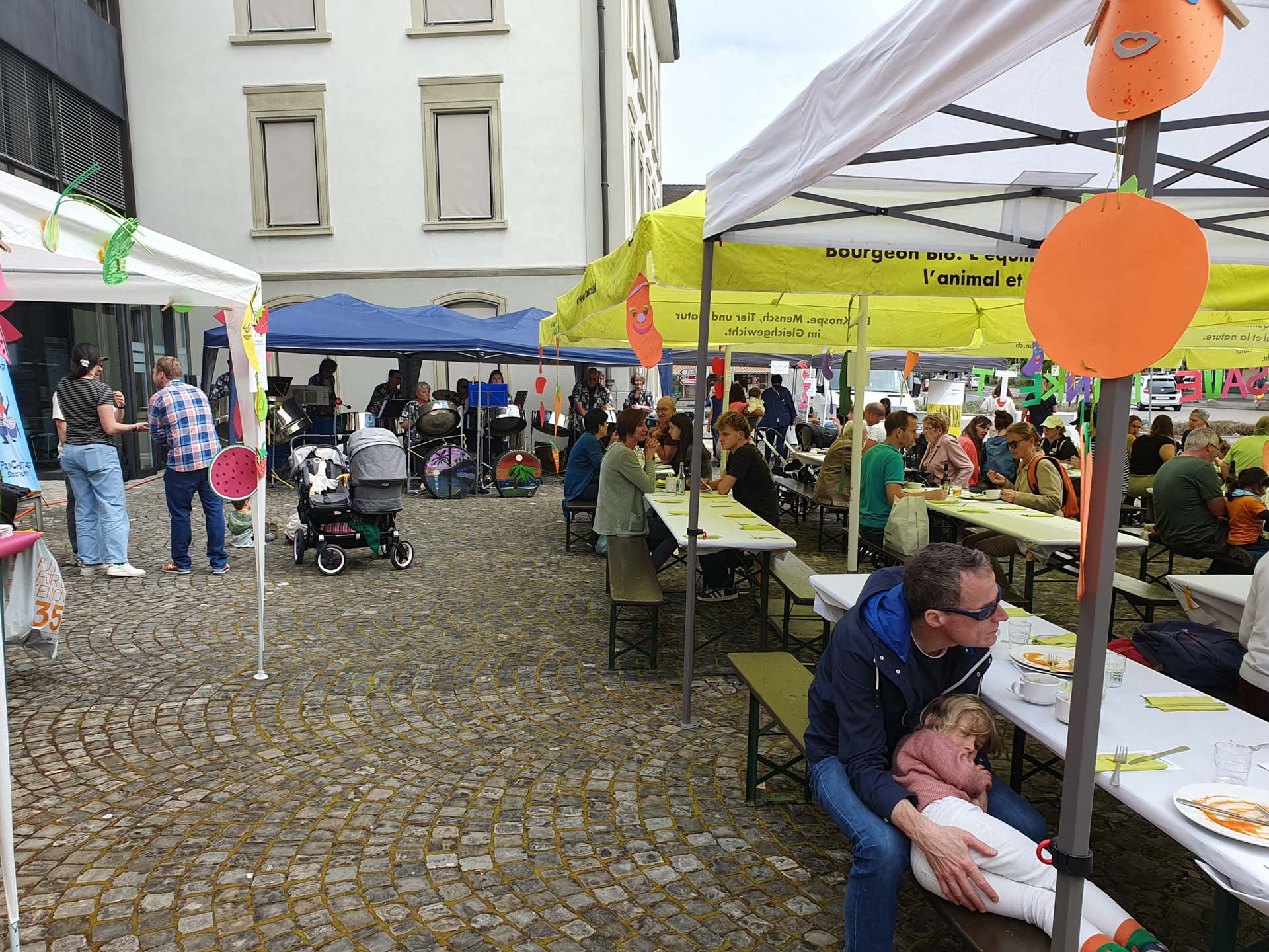 So traf sich eine grosse, buntgemischte Personenschar auf dem Zuchwiler Gemeindeplatz und tafelte gemütlich unter schattenspenden Schirmen und Bäumen. Die bestbekannte Steelband «PanChitas» steuerte dem Anlass mit ihren karibischen Klängen gar etwas Ferienstimmung bei. An den St(r)änden der Umweltberaterin Alessia Bätsch sowie des Wallierhofs Riedholz konnte viel Interessantes zur Nachhaltigkeitsthematik erfahren werden.